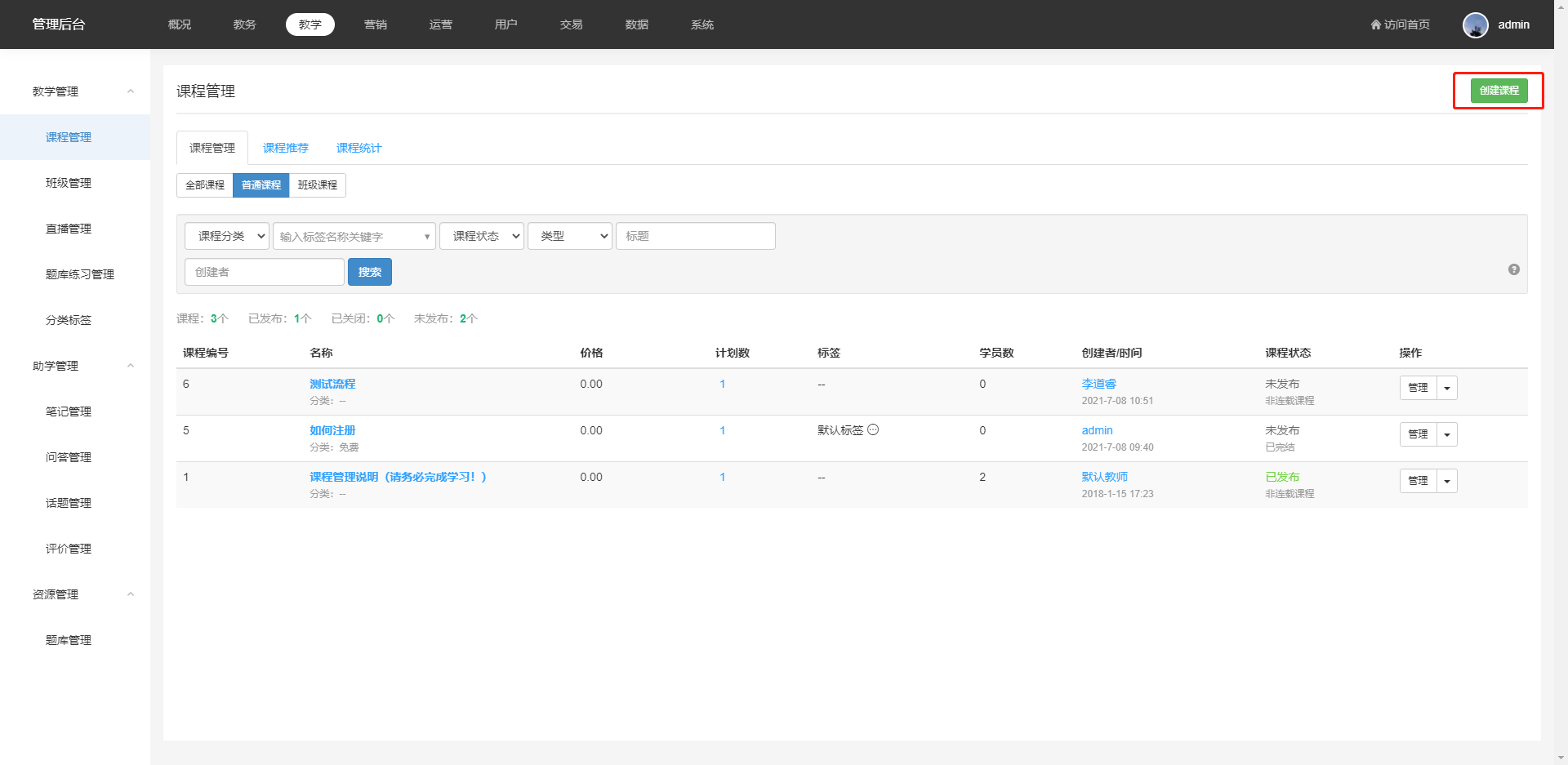 路径:【管理后台】-【课程】-【课程管理】-【创建课程】,只有管理员有权限进入管理后台,教师可以在【我的教学】创建课程。