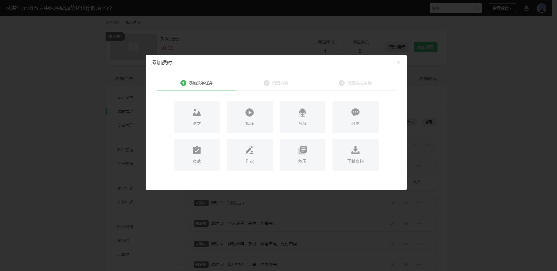 创建课程后,进入课程管理页(即设置课程名称和介绍的地方),找到【课时管理】或者【计划任务】,点击添加,选择【视频】,上传视频保存,发布课程。