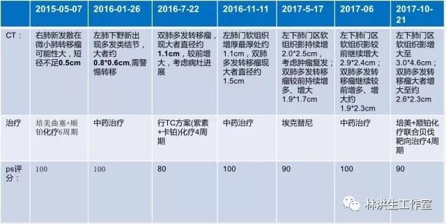 【现病史】患者2014年7月就诊于中国医学科学院肿瘤医院诊断左肺下叶腺癌行手术切除pT3N2,术后辅助化疗后不到1年2015年5月复查发现双肺转移,基因检测阴性,中西医结合至今,病灶进展缓慢,体力状况PS 100分。