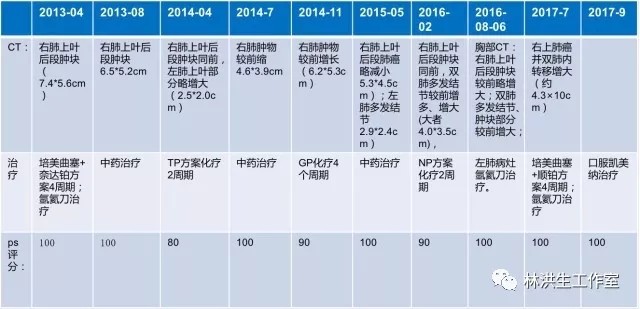【现病史】患者2013年4月诊断右肺低分化腺癌(7.4*5.6cm),双肺多发转移,基因检测:EGFR(-)。行培美曲塞+奈达铂方案4次化疗及氩氦刀治疗后肿物缩小(5.5*4.8cm),疗后评价:缩小SD。中西医结合至今,病灶进展缓慢,体力评分PS100分。